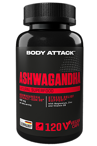 Superalimentul suprem pentru cea mai bună performanță are un nume: ASHWAGANDHA de la BODY ATTACK. Ashwagandha vegană cu doză mare, 600 mg de material brut de marcă KSM 66 pe porție zilnică! Medicina Ayurvedică se bazează de mult timp pe ginsengul indian pentru capacitatea sa de a reduce stresul biologic. Ai nevoie de recuperare optimă pentru a construi mușchi și o obții cu ajutorul magneziului suplimentar, zincului și vitaminei B6 incluse în fiecare capsulă de ASHWAGANDHA!