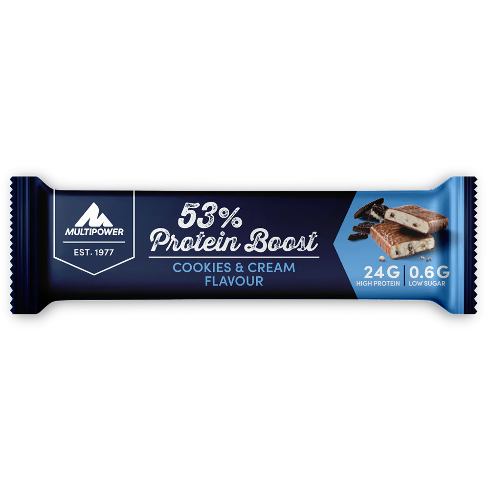 Noul Batonul 53% Protein – Cookies & Cream oferă un aport crescut de 24g proteine per baton, într-o rețetă îmbunătățită ce combină eficiența nutrițională cu un gust bogat și cremos de biscuiți și frișcă.