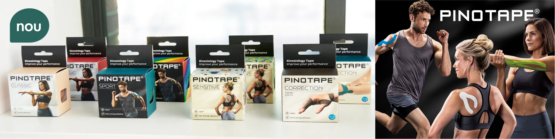 - PinoTape: Bandă kinesiologică de calitate germană, fabricată din mătase naturală premium sau bumbac de top. Are adeziv 100% acrilic și rezistență ridicată, fără a conține latex. Este potrivită pentru utilizări exigente și oferă susținere foarte bună în timp ce lasă pielea să respire.