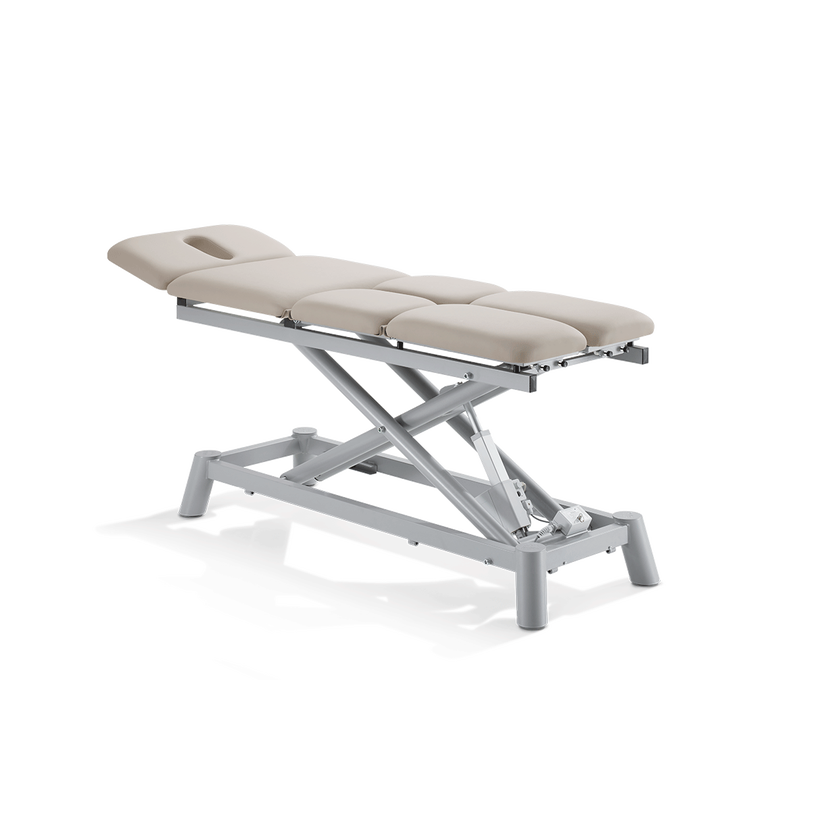 Patul electric de terapie PINOPRO LYMPH se remarcă prin calitatea superioară și designul inovator. Cadrul de tip foarfecă, realizat din tuburi rotunde de dimensiuni mari, oferă stabilitate maximă și funcționează fără deplasare laterală. Suprafața de lucru este formată din 5 părți, cu 4 secțiuni pentru picioare, fiecare fiind reglabilă independent printr-un arc pneumatic blocabil. Datorită motorului german de calitate, pacienții pot fi poziționați în siguranță și liniște la înălțimea optimă pentru tratament. Tapițeria premium asigură un confort excepțional și o durabilitate îndelungată.