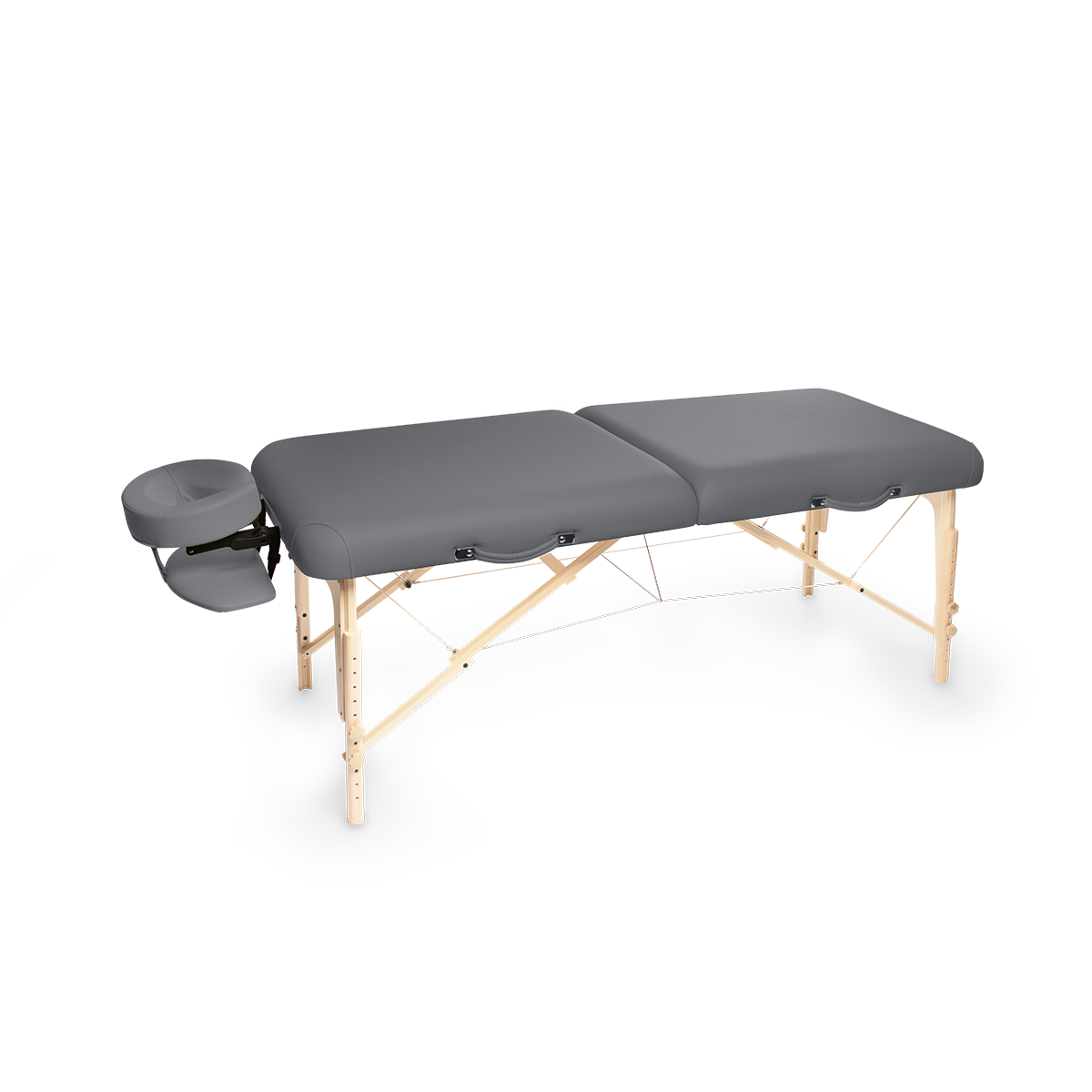 Spre deosebire de paturile de terapie convenționale, aceast pat de masaj se pliază rapid și ușor într-o formă compactă de valiză. Greutatea redusă și geanta de transport inclusă în pachet facilitează transportul. Deși patul cântărește doar 18 kg, cadrul stabil din lemn de fag poate susține până la 180 kg – ideal pentru tratamente de fizioterapie, masaje sau aplicații de relaxare cu timbre din plante sau pietre fierbinți. Soluția mobilă nu face compromisuri în privința confortului pentru pacienți: tapițeria extra groasă și suportul suplimentar pentru brațe garantează confort maxim, chiar și în poziția pe burtă. Tetierele pot fi înclinate atât pozitiv, cât și negativ, iar înălțimea suprafeței de lucru poate fi ajustată individual. Proiectată pentru utilizare profesională mobilă sau staționară.