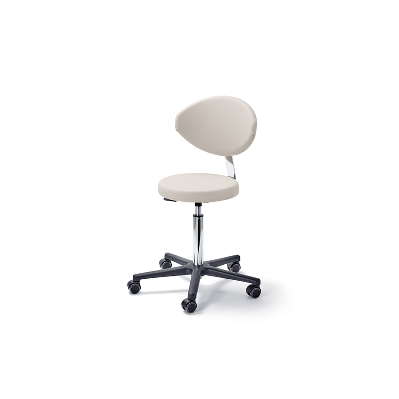 Scaunul mobil lucrat manual, cu șezut rotund, impresionează prin tapițeria sa confortabilă. Husa din piele ecologică originală skai® este cusută cu mare atenție, fiind deosebit de rezistentă la rupere și abraziune. Roțile robuste sunt potrivite pentru podele dure și au o durată de viață lungă. Spătarul extra-lat oferă confort sporit și sprijină o poziție de ședere dreaptă și stabilă. Ideal pentru utilizare zilnică în cabinet sau spa.