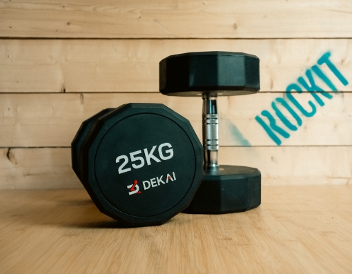 Designul hexagonal previne rostogolirea, oferind astfel siguranță și stabilitate în timpul antrenamentelor. Mânerul ergonomic și texturat asigură o prindere confortabilă și sigură, minimizând riscul de alunecare.